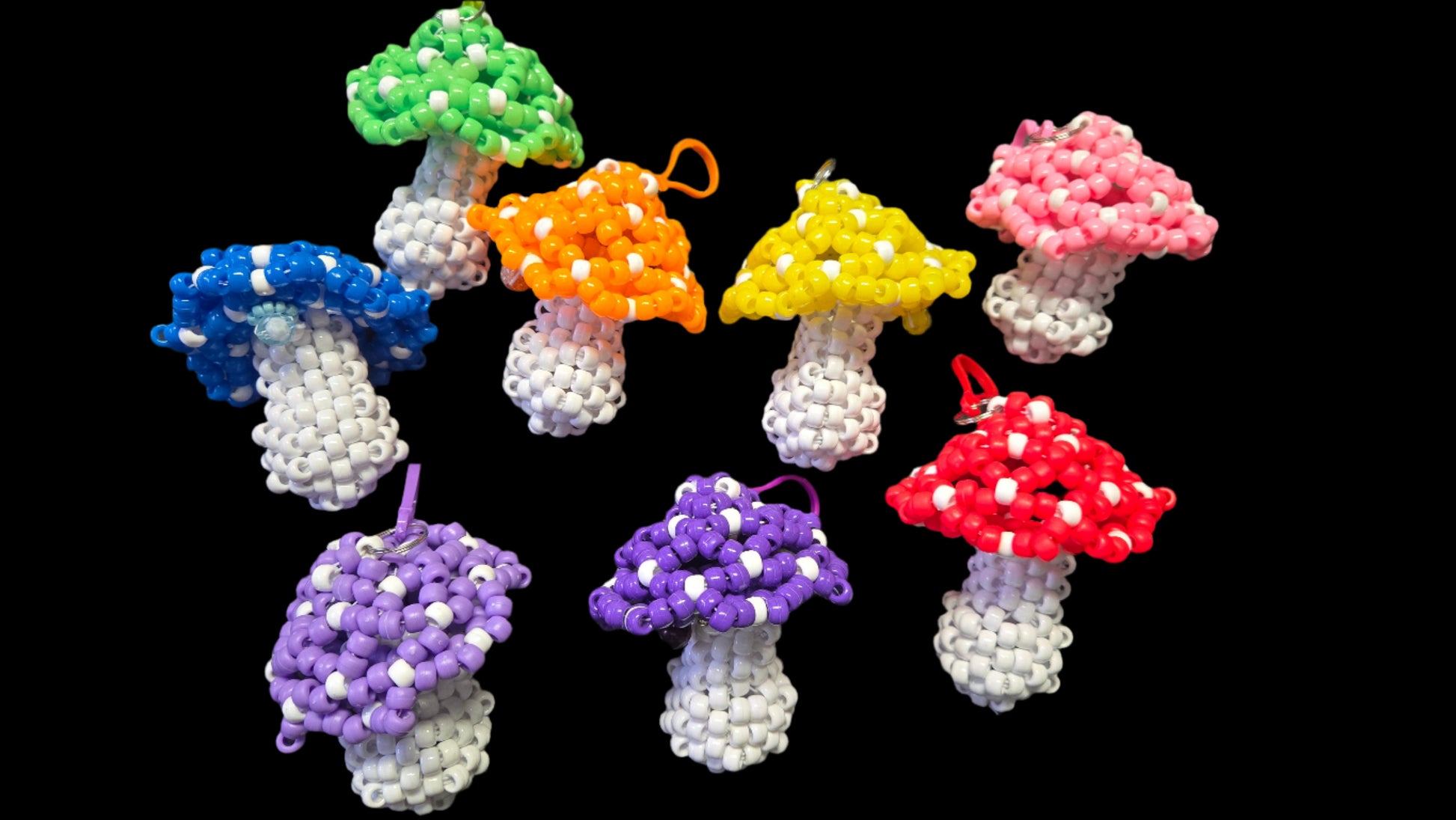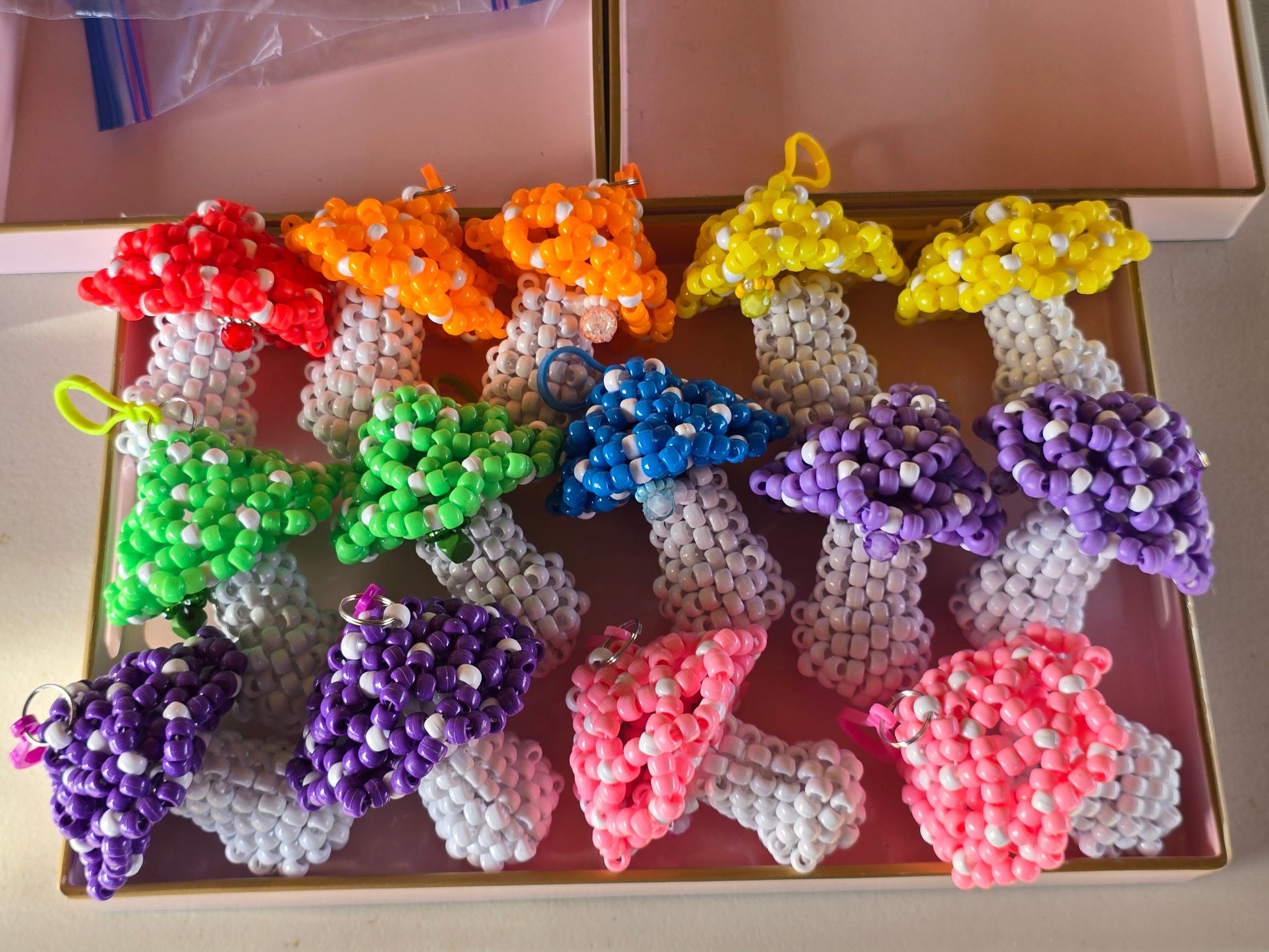 Kandi mushroom keychain with a small pouch. It comes with a lip balm. It also fits a standard lighter, and other small items.